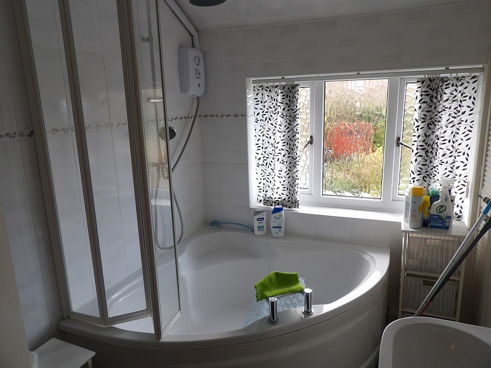 Heading back down the hallway and upstairs, you’ll find the spacious family bathroom on the left at the top of the stairs. It’s got a large corner bath, perfect for unwinding after a long day working in the garden, plus an electric overhead shower if you’re after a quicker rinse in the morning. There’s also a toilet and a pedestal basin.